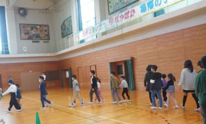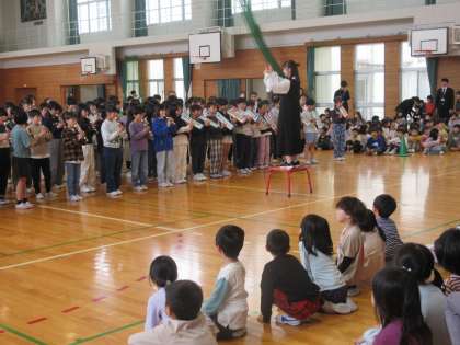 お兄さん、お姉さんにダンスや演奏でお祝いしてもらいました。お礼に「1ねんせいになったら」を元気よく歌いました。