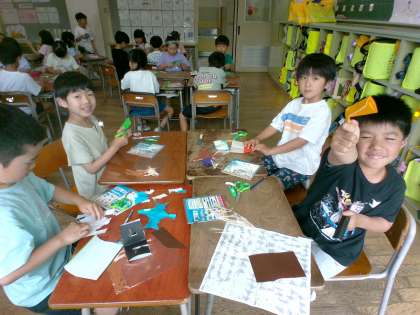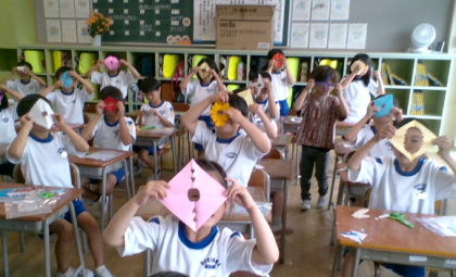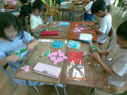 図画工作で折り紙を使った切り紙の工作をしました。切った後に折り紙を開いて出来上がる模様を見て楽しそうにしていました。