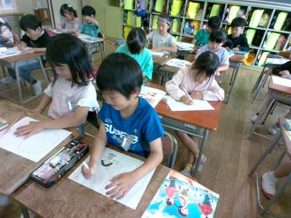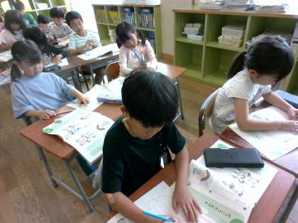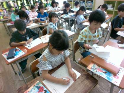道徳では、学校探検をしたはなちゃんの気持ちを想像して、プリントに書きました。みんな真剣に書いていました。
