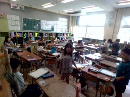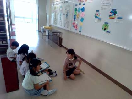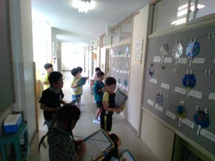 図画工作科の学習では、「光のプレゼント」で作ったうちわの鑑賞会をしました。自分の作品の工夫点を書いたり、友達の作品のいいところを書いたりしました。