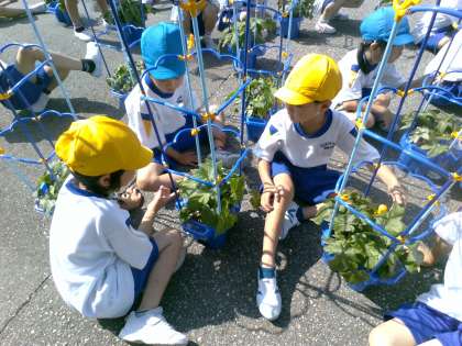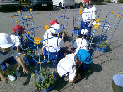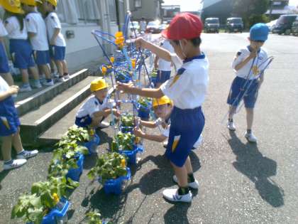 あさがおも、だんだん生長しきたので支柱をたてました。もっと大きくなるように、一生懸命お世話をしています。