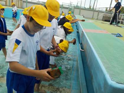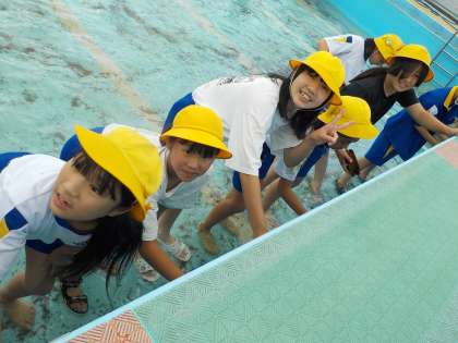 プールの中やプール再度をブラシを使って丁寧にこすりました。一生懸命頑張りました。