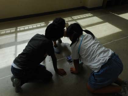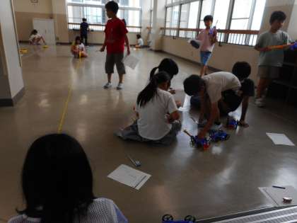 「風とゴムのはたらき」の学習では、風に続いて、ゴムで動く車を使って実験をしました。グループで協力しながら、取り組んでいます。