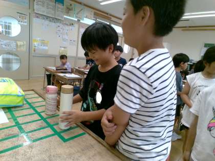 水筒に入っている水のかさを比べる活動をしました。重さに目をつけている子、水筒の高さや幅に目をつけている子など、様々な視点で予想を立てていました。