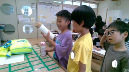 水筒に入っている水のかさを比べる活動をしました。重さに目をつけている子、水筒の高さや幅に目をつけている子など、様々な視点で予想を立てていました。