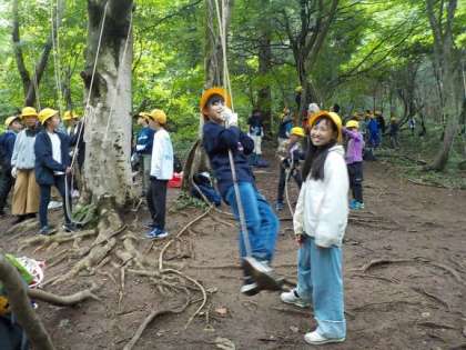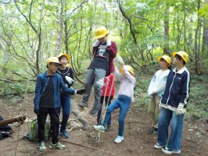 ブランコやターザンを作るために、班で協力してアイデアを出し合う様子が見られました。