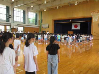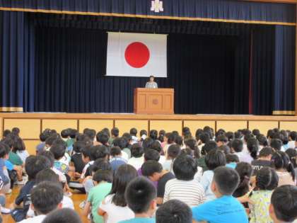 全校児童が体育館に集まって2学期の着任式・始業式を行いました。今学期からお世話になる養護教諭の先生が、着任されました。