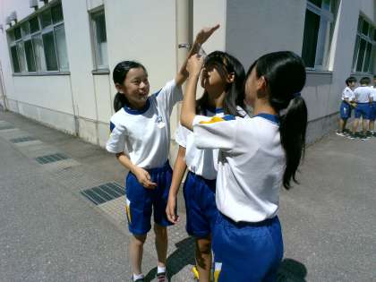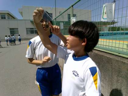 できるだけ正確に求めようと、協力して角度を測っていました。
