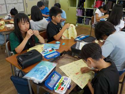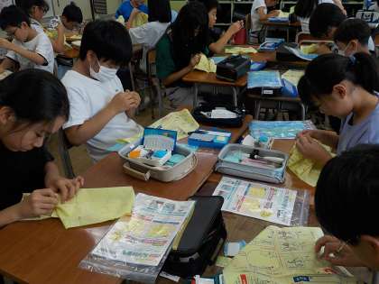 家庭科では針と糸を使って手縫いに挑戦しています。「なかなか針に糸が通らないよ」「玉どめってどうやったら上手くいくのかな」と初めての経験に苦戦しながら、何度も繰り返し練習をしました。