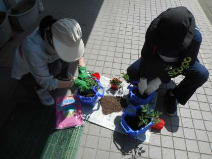 2年生の生活科の学習では、ミニトマトを栽培します。子供たちが育てるミニトマトの苗を植えました。子供たちが登校するまでは、学校で水やりをしながら大切に育てます。子供たちと一緒に観察できるときを楽しみに待っています。