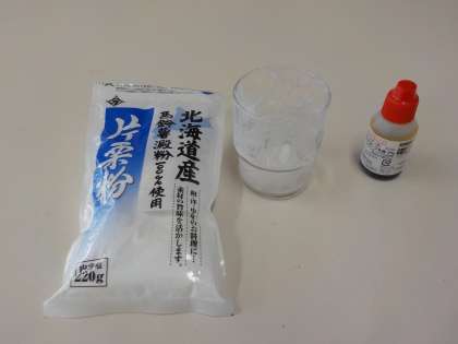 保健室で、手洗いの実験をしました。準備物は、でんぷんのり(片栗粉と水を混ぜ合わせたものでも代用可能)とうがい液(ヨウ素を含むもの)です。