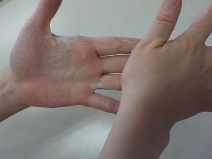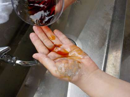 片栗粉と水を混ぜたものを手に塗ります。片栗粉が乾いたら、水で手洗いをします。規定量に薄めたうがい液を手にかけます。汚れが残っている部分は紫色になります。その後、石けんを使って手を洗い、もう一度うがい液をかけました。