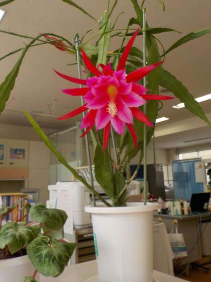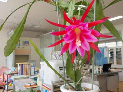 今日から学校が再開しました。子供たちの元気な姿が見られてうれしいです。それと同時に、保健室にある「クジャクサボテン」の花が咲きました。クジャクサボテンも学校再開を喜んでいるようです。