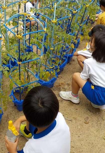 ミニトマトの苗の観察を始めてから1ヶ月が経ちました。トマトの実もだいぶん大きくなり、赤くなり始めています。子供たちは収穫の日を楽しみにしながら、お世話を続けています。