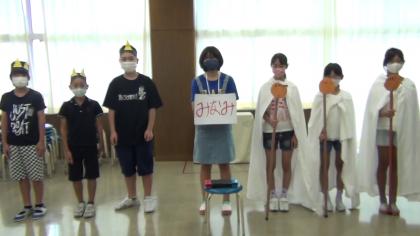 劇「みなみさんの一日」を演じた子供たちです。鬼の誘惑に負けず、メディアコントロールをすることで、規則正しい生活につながり、毎日元気に過ごせることを、劇を通して伝えました。