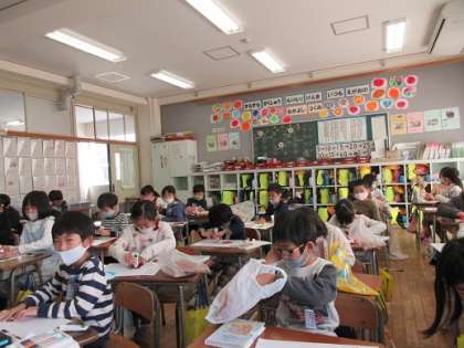 11月12日(木)に1・2・3組が、13日(金)には4・5組が、生活科の学習で秋を探しに校区の公園へ出かけました。校庭とは違う色や形の葉を見付けたり、どんぐりを付けた木の様子を見ることができました。音を感じたり、葉っぱのシャワーをしたりして、秋を楽しみました。学校に帰った後は、自分たちが拾ってきた、様々な秋の物を使って、それぞれ思い思いの作品をつくりました。
