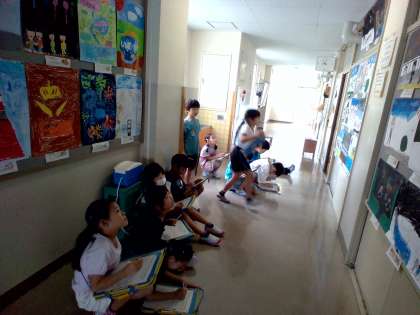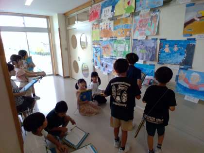 自分が描いた作品の頑張ったところや工夫したところを考えたり、友達の作品のいいところを見て回ったりしました。