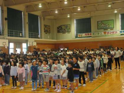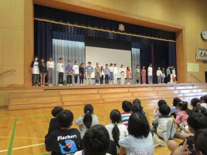 今日は、全校集会「みんなで堀南を盛り上げよう集会」が、行われました。それぞれの委員会の活動紹介、ダンスクラブのダンス、手話クラブのクイズなど温かな雰囲気が体育館にあふれていました。集会の最後には、全校児童の「たいようのサンバ」の合唱があり澄み切った歌声が、秋空に響いていました。