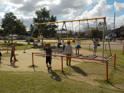校外学習では歩いて朝菜町公園に行きました。秋のものを見つけたり、遊具で遊んだりして楽しく過ごしました。