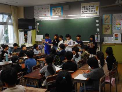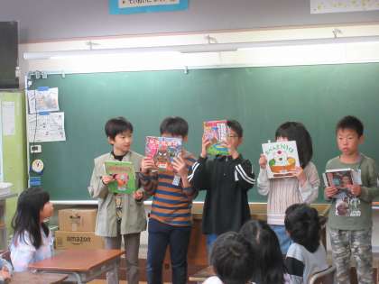 国語で1年生におすすめしたい本を話し合い、決まった本を紹介しに行きました。1年生がたくさん読んでくれるとうれしいですね。