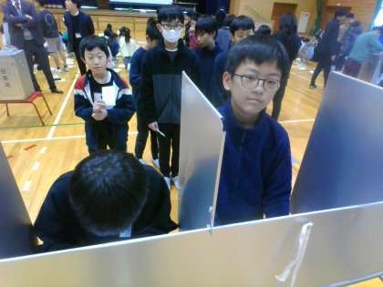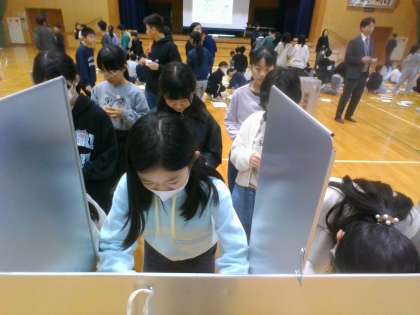 模擬選挙では、立候補者の公約を読み、街をよりよくするためには誰が代表になればよいのかを考えて投票しました。