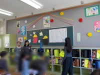 日頃お世話になっている地域の方々に感謝の気持ちを伝えるために、「青い空に絵をかこう」を歌いました。今まで一生懸命練習した歌や振り付けを、笑顔で発表しました。