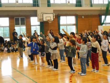 日頃お世話になっている地域の方々に感謝の気持ちを伝えるために、「青い空に絵をかこう」を歌いました。今まで一生懸命練習した歌や振り付けを、笑顔で発表しました。