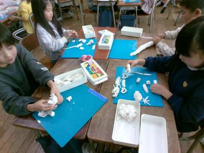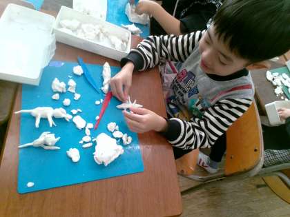 図画工作では、粘土で散歩をしている自分を造りました。いろいろな動物や恐竜など、様々な動物と散歩をする様子をイメージしながら、楽しそうに活動していました。