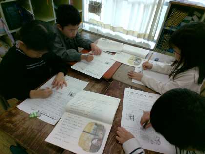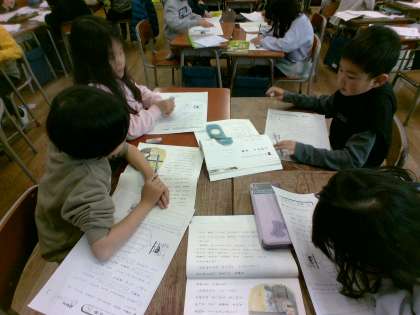 物語を読んで、登場人物の気持ちを想像して書きました。自分の考えを伝えたり、グループの友達に相談したりしました。
