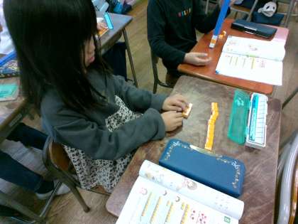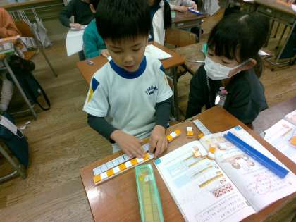 ブロックを使って計算の仕方を考えました。自分の考えた方法を教えたり、友達と同じ動かし方でブロックを操作したりしました。