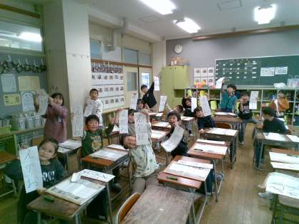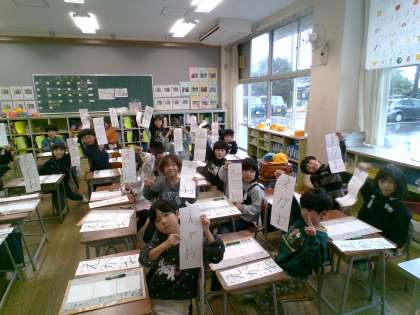 初めて「書き初め」の練習をしました。「えがお」の文字を真剣に書きました。書いた後は笑顔いっぱいでした。