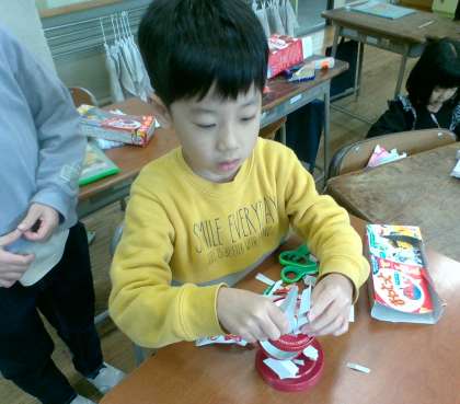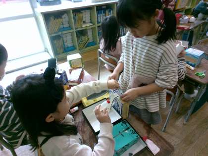 たくさんの箱を使って工作をしました。箱の形からイメージをふくらませ、楽しそうに作っていました。