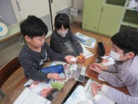 電子てんびんを使って、体積が同じ物の重さを比べています。体積をそろえるために、慎重にすりきりしています。