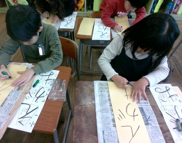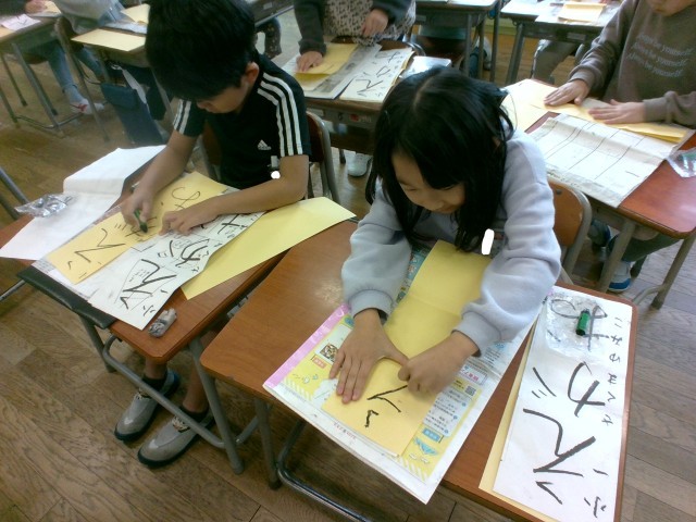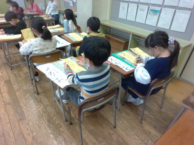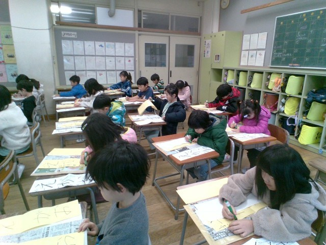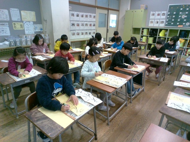 書き初め大会では、真剣な様子で「えがお」を書きました。冬休みにたくさん練習した成果が出ました。