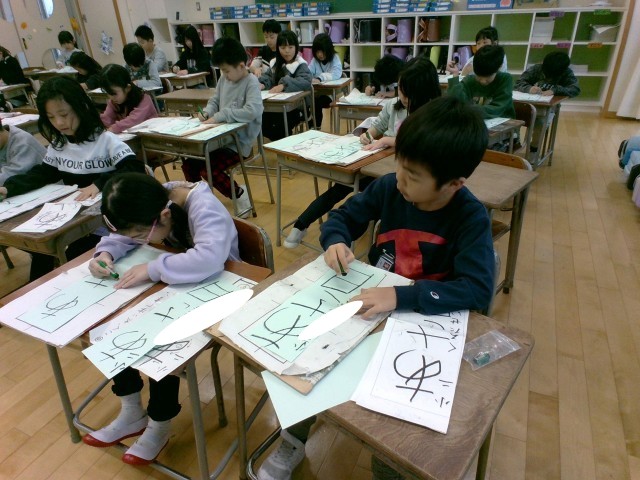 書き初め大会では、集中して「あさ日」の3文字に向き合っていました。