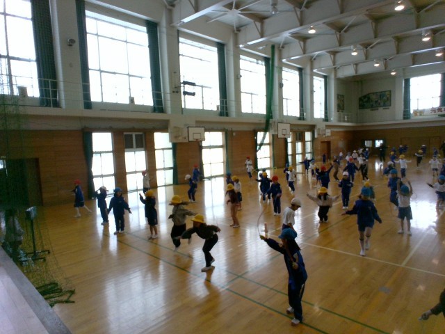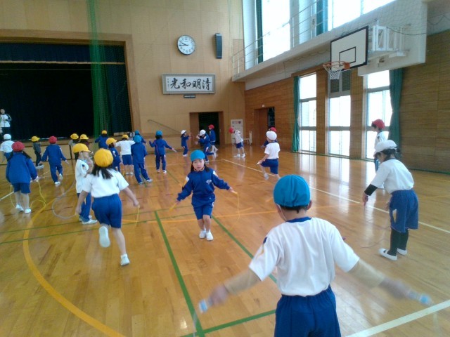 体育では、いろいろな縄跳びの技に挑戦しました。できる技を増やしたり、跳べる回数を増やそうとしたり、一生懸命練習していました。