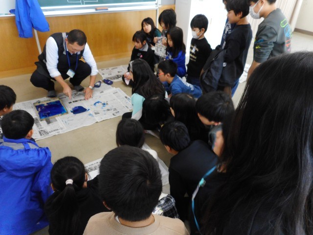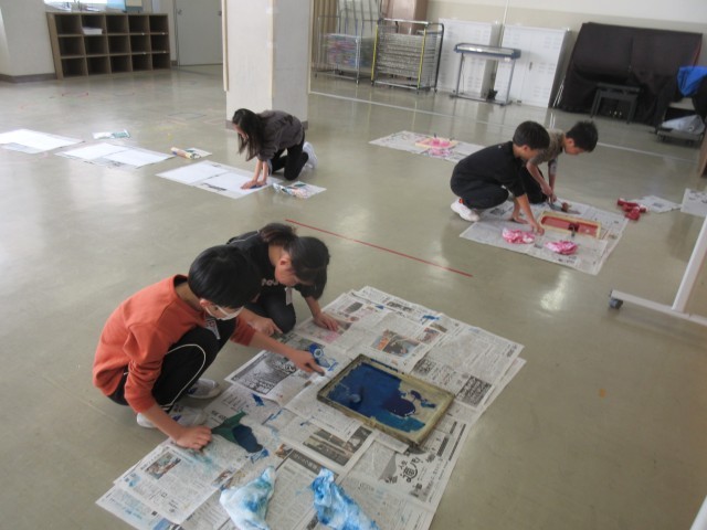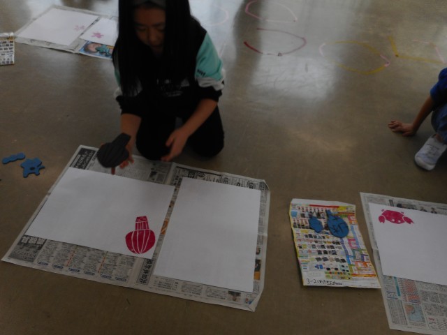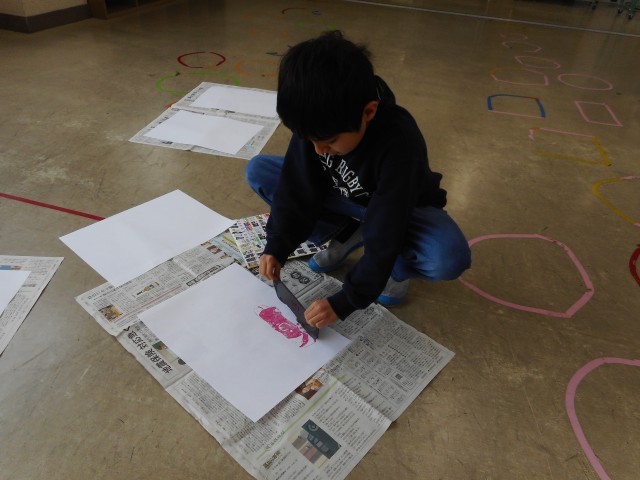 初めての彫刻刀で彫ったゴム版を印刷しました。インクをつけてきれいに写せましたね。