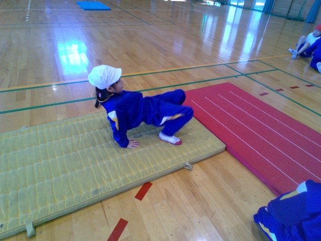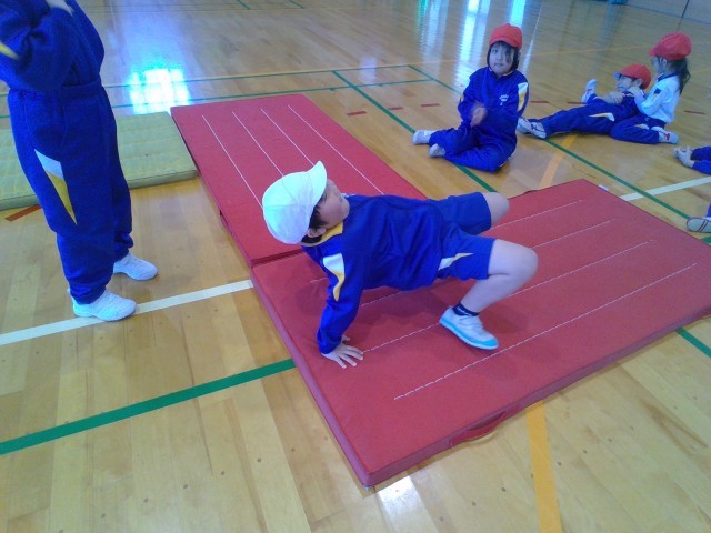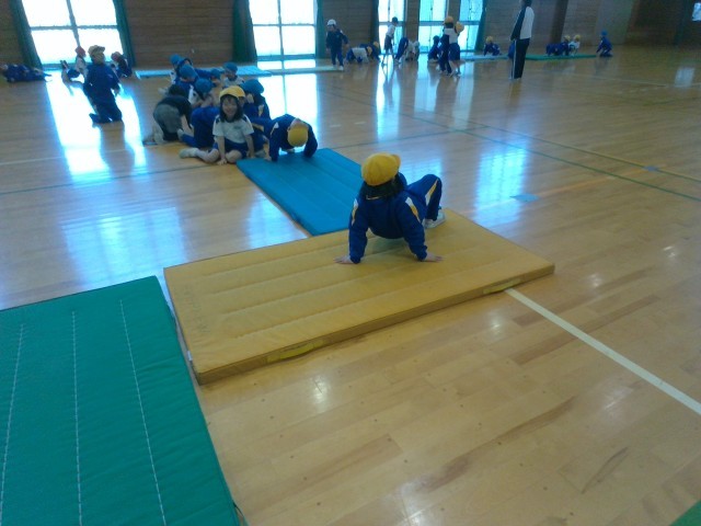 体育では、ジグザグに置かれたマットの上で動物歩きをしました。犬歩きやくま歩き、くも歩きなど、いろいろあるき方に挑戦しました。