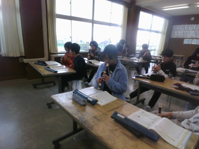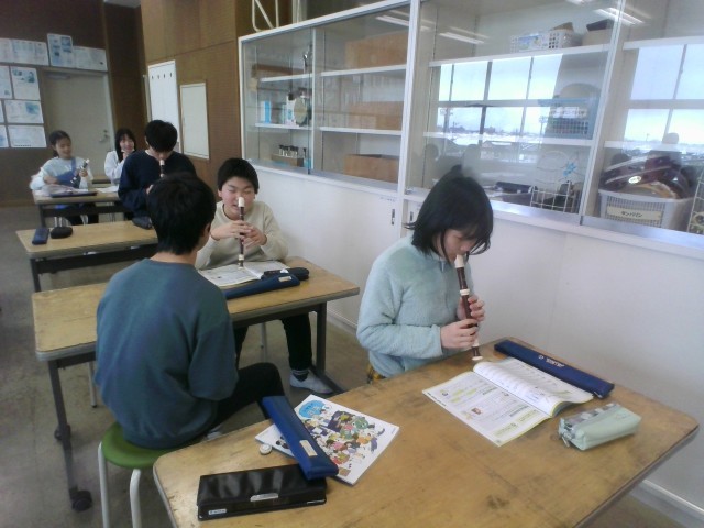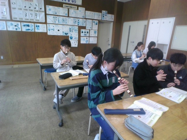 リコーダーの練習をしています。運指に気をつけて、美しい音を響かせられるよう演奏をすることができました。