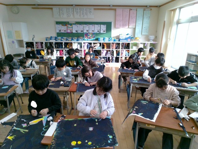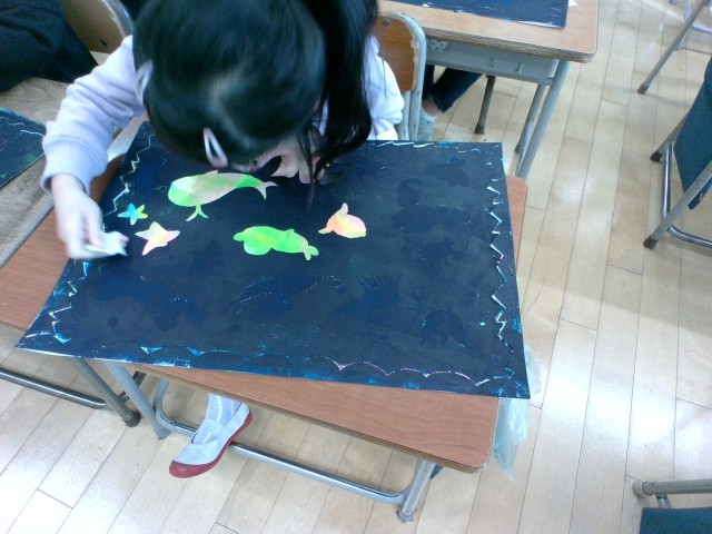 最後の仕上げに、シールをそっとはがしています。黒いインクの下から出てくるカラフルな模様が見えてくると、子供たちから歓声が上がりました。学習参観の際、ご覧ください。