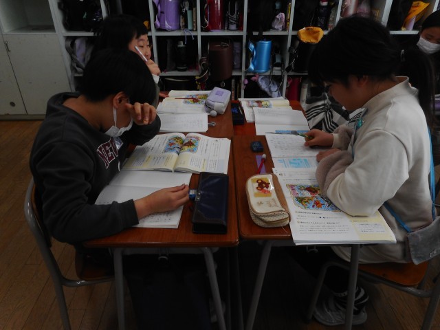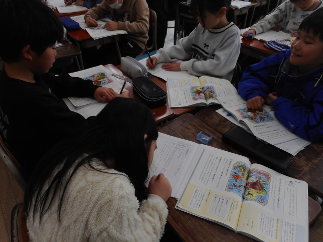 国語では、たから島の地図を見ながらグループでどんな冒険ができるか話し合っています。