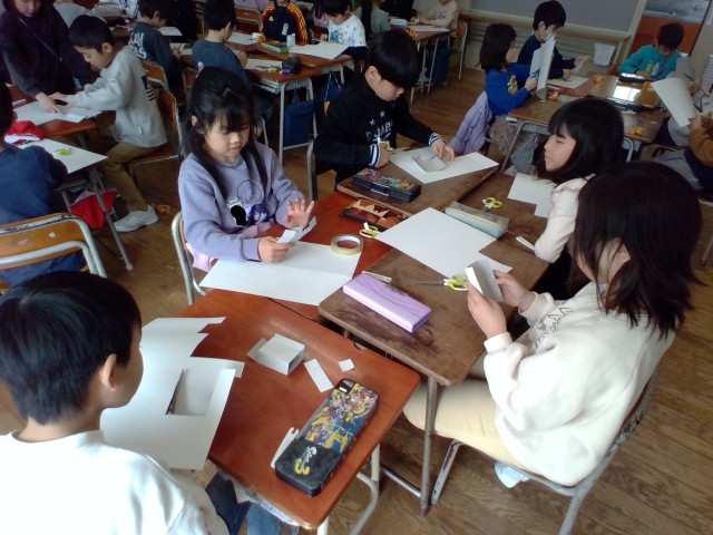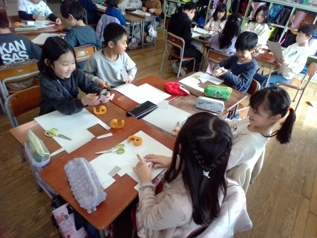 算数科のはこの形の学習では、直方体づくりに挑戦しました。面の数や、同じ形の面を探して楽しく作ることができました。