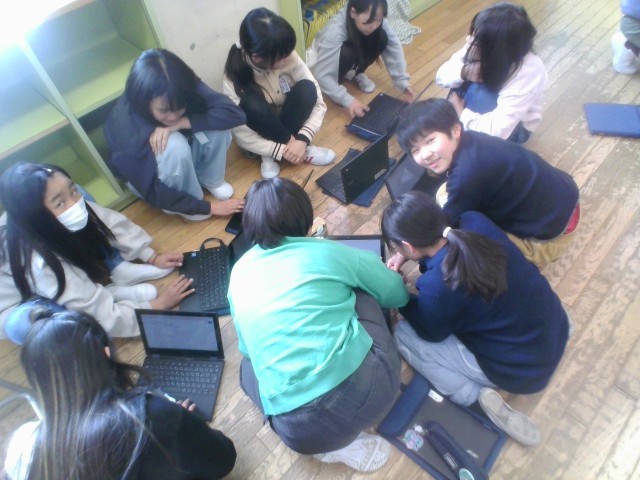応援合戦について考えています。4つの団は、それぞれ思いを込めて応援歌やエールを考えました。