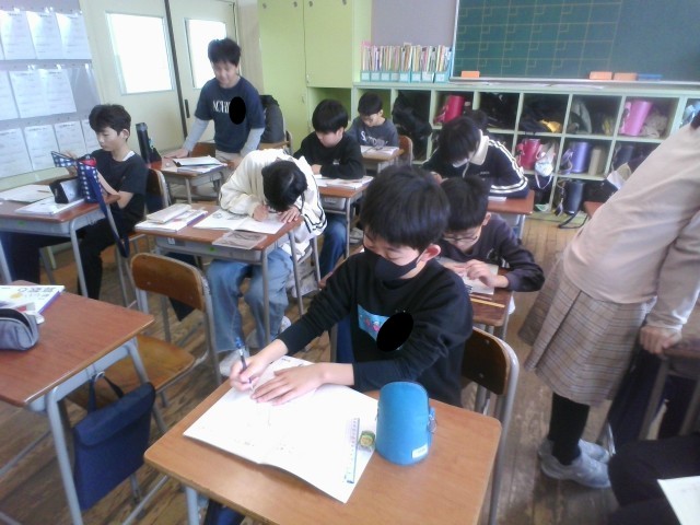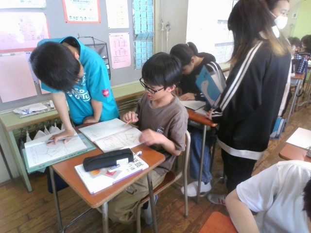 線対称な図形とは何かについて考えています。子どもたちは、辺の長さや角の大きさに注目して説明することができました。
