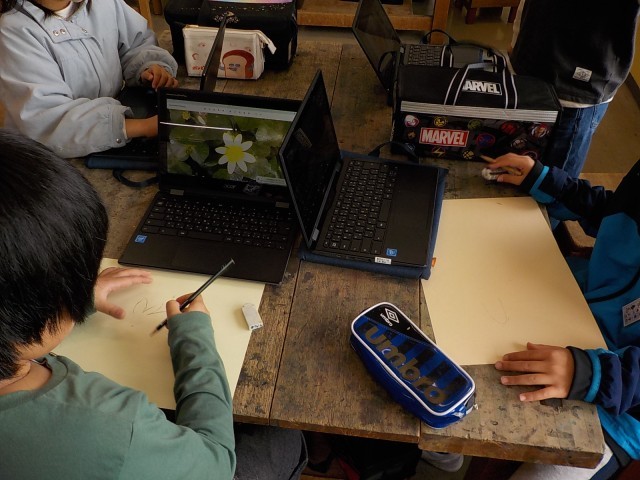 今日、4年生になって初めての図工がありました。朝、子どもたちは今日の時間割を見て、「やったあ図工だ」と喜んでいました。春の花の花びらの模様や形等をよく見て、真剣に描いています。完成が楽しみです。