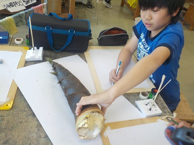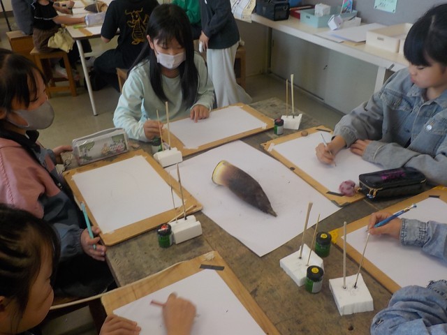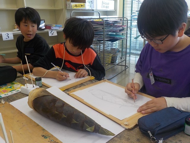 図画工作科の時間に、たけのこを描きました。本物のたけのこを見て、実物に近づけるように形や色を工夫しました。