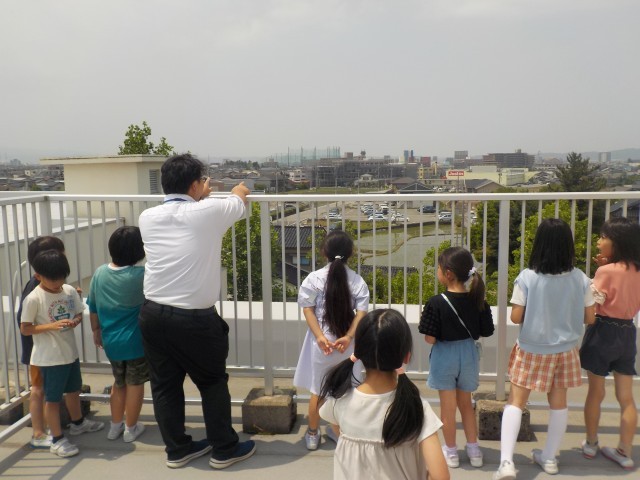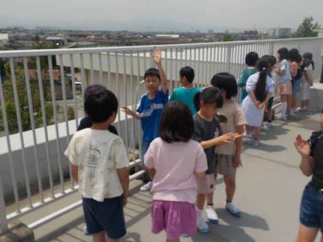 今日は社会科の学習で、方位磁針を使いながらどの方角にどんな建物があるかを見てみました。子供たちは、初めて屋上に出て学習したので、楽しそうに四方位を見ていました。