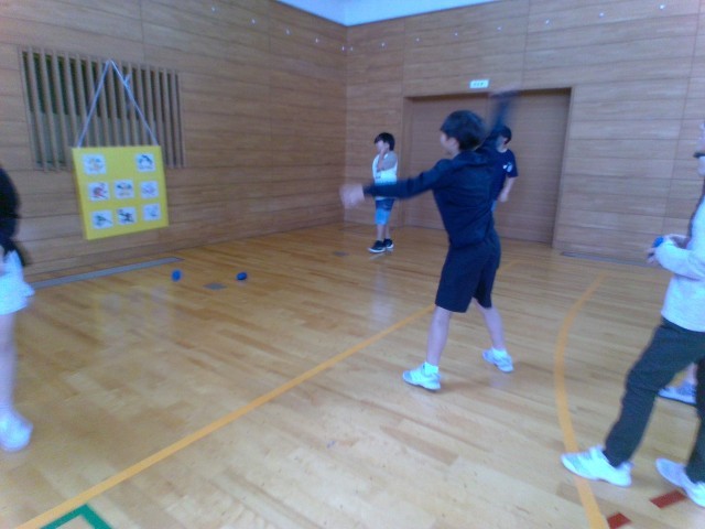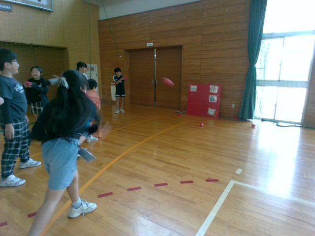 お手玉を的に向かって投げていますが、なかなか当たらず、悔しそうにしている子もいました。