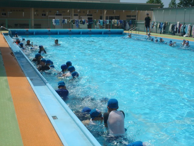 はじめに、プールの使い方や注意点についての約束を聞きました。次に、運動委員会委員長が、児童代表誓いの言葉を堂々と述べました。その後、学年ごとにプールに入りました。子供たちは、今年初めてのプール学習を楽しんでいました。