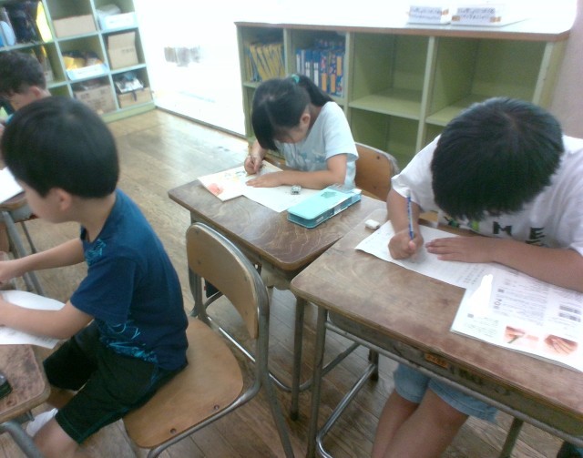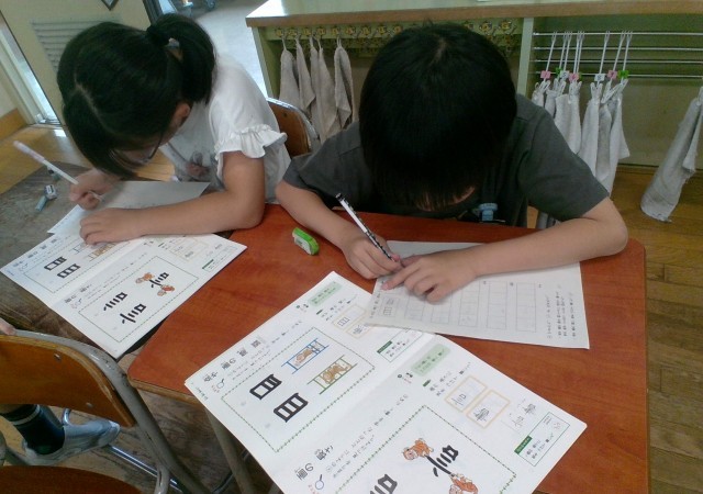 書写では、点や画の間を同じにすると整った字が書けることを勉強しました。きれいな字になるように、間に気を付けて丁寧に漢字を書いていました。